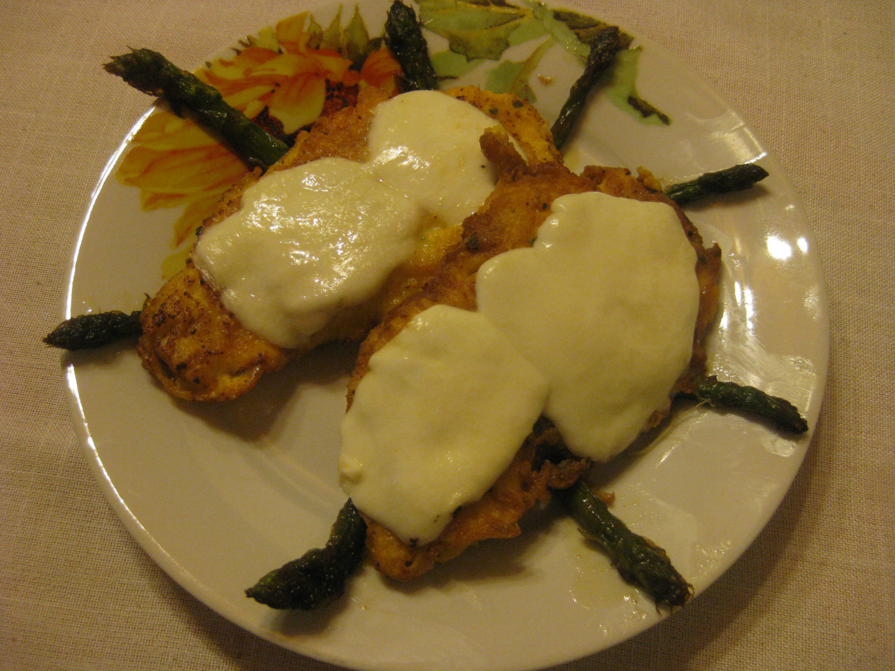 Togliere dal forno, disporre nel piatto due fettine di polli e 5 asparagi a testa e servire ben caldo, irrorato il tutto col burro fuso.